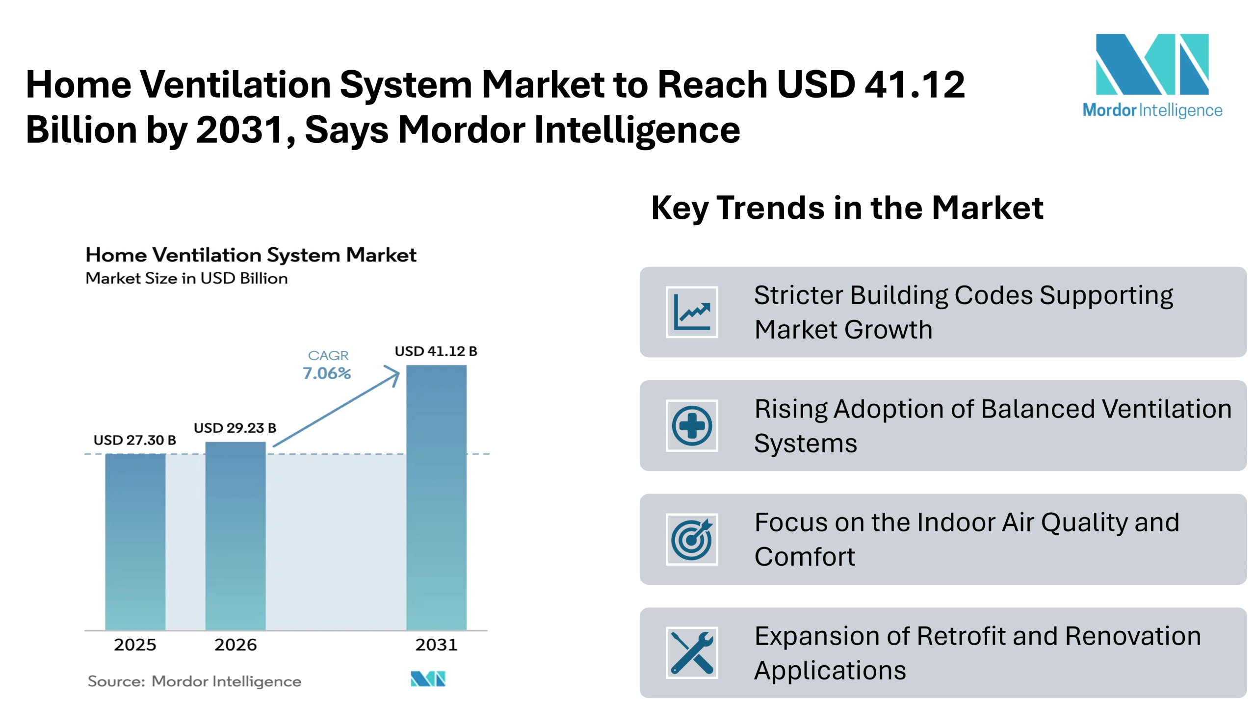 According to Mordor Intelligence, the home ventilation system market size is projected to grow from USD 27.30 billion in 2025 to USD 29.23 billion in 2026 and reach USD 41.12 billion by 2031, growing at a CAGR of 7.06%. This steady market growth reflects rising awareness around indoor air quality, along with stricter building standards that require better airflow management in residential spaces.